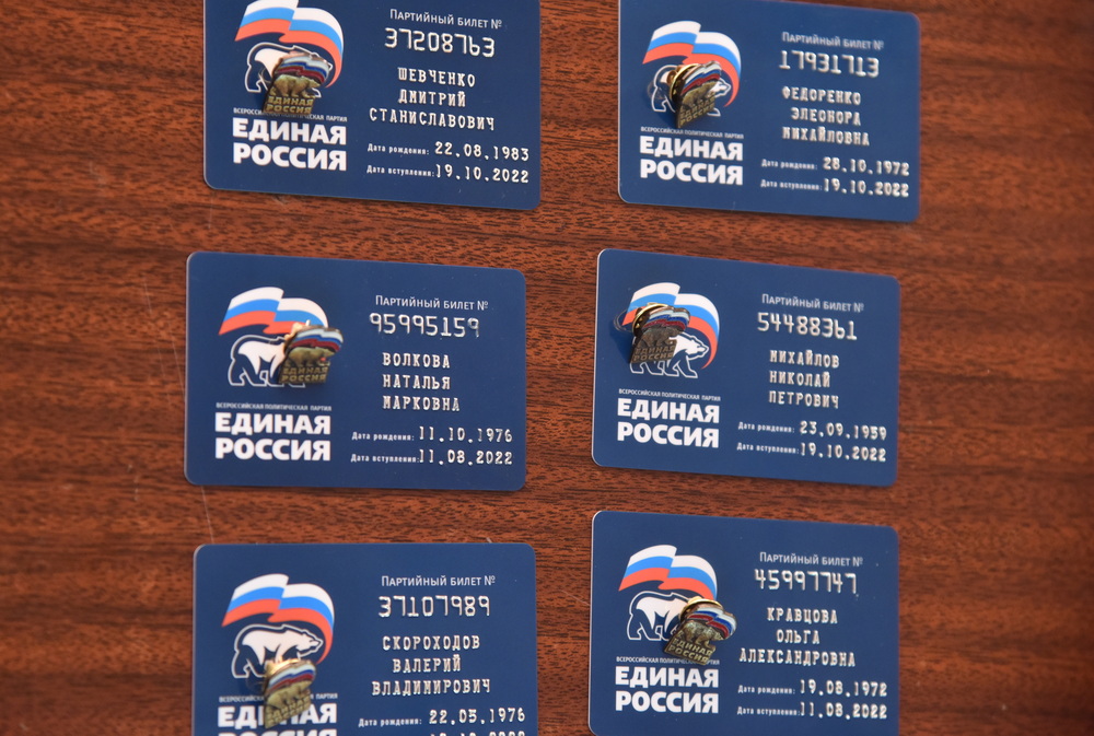 По завершении расширенного заседания Денис Пушилин и Андрей Турчак торжественно вручили партийные билеты «Единой России».