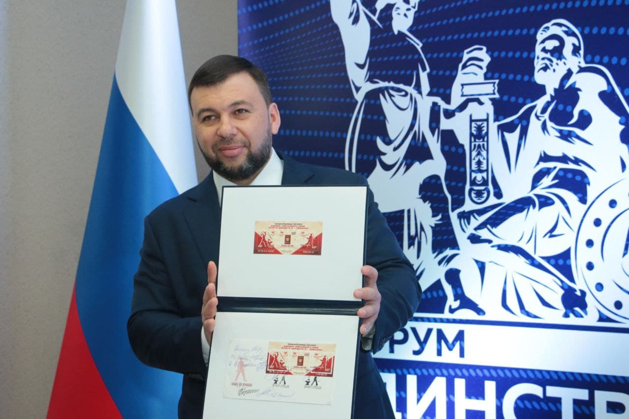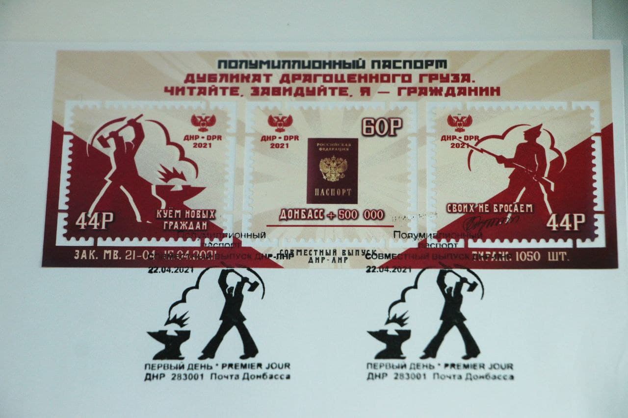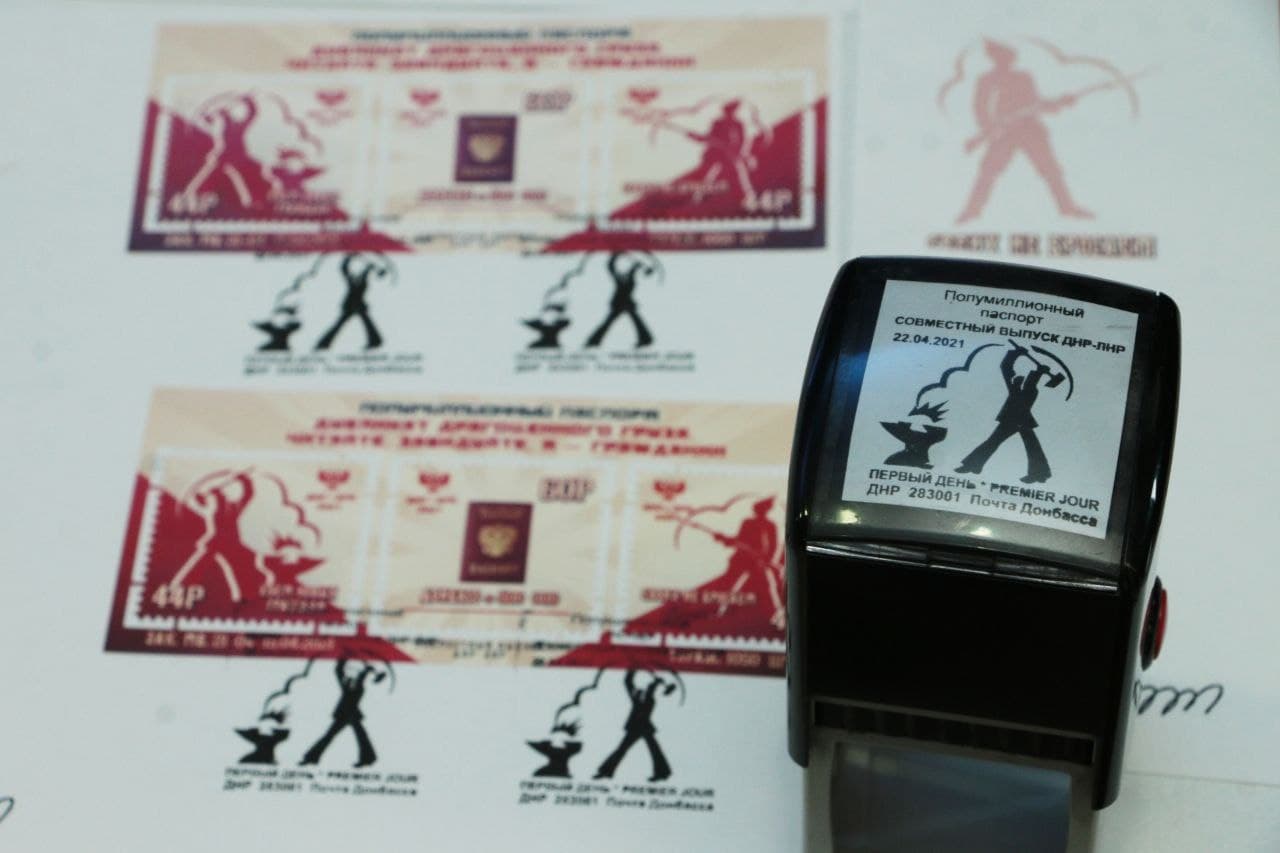 Сегодня, 22 апреля, в рамках проведения международного форума «Единство русских: защита прав и свобод», Глава Донецкой Народной Республики Денис Пушилин принял участие в торжественной церемонии специального гашения почтового блока «Полумиллионный паспорт». Данный почтовый блок является совместным выпуском почтовых ведомств ДНР и ЛНР, и посвящен выдаче жителям Донбасса 500 тысяч паспортов Российской Федерации.
