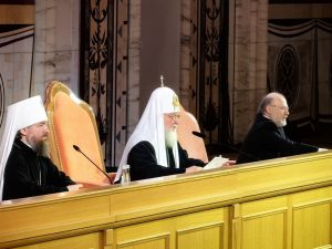 С докладом в зале церковных соборов кафедрального соборного храма Христа Спасителя в Москве выступил Святейший Патриарх Московский и всея Руси Кирилл.