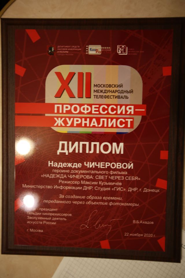 22 ноября были объявлены победители XII Московского Международного телефестиваля «Профессия – журналист», среди них оказался и фильм из ДНР. Специальным дипломом жюри была отмечена Надежда Чичерова, как героиня документального фильма. Режиссер Максим Кузьмичёв (Министерство информации ДНР, студия «ГИС», ДНР, г. Донецк) – за создание образа времени, переданного через объектив фотокамеры.