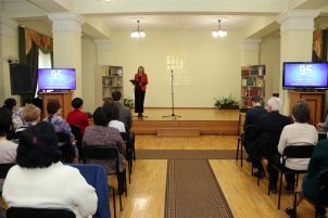 «Примите сердечные поздравления с замечательной датой! Открытие библиотеки в городе Сталино 95 лет назад стало настоящим историческим событием, которое было продиктовано потребностью жителей в знаниях и информации. Каким бы сложным не был период в истории нашей страны: будь то становление Советской Республики, тяжелые военные годы, послевоенное возрождение, годы перестройки, современный период, — библиотека всегда находила пути успешного развития в соответствие с требованием времени…