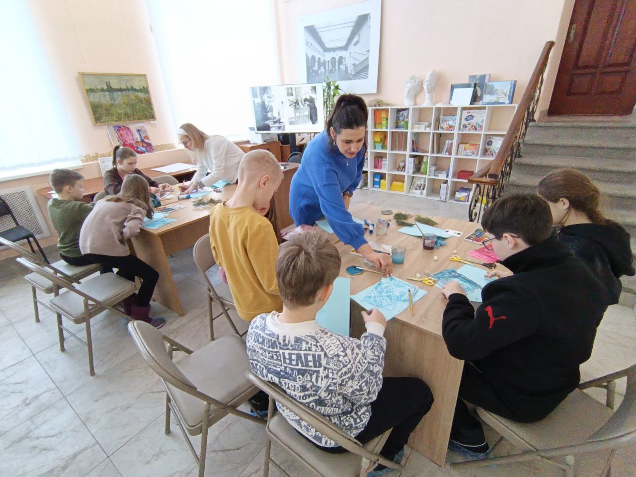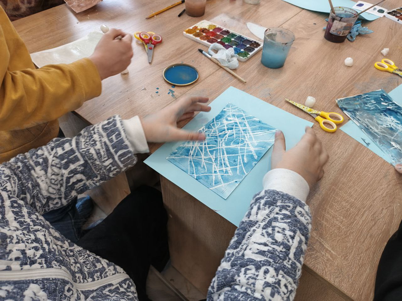 Кроме того, ребята рассматривали узоры снежинок и кристаллическую структуру льда, изучали растительные и животные материалы, освоили технику рисования воском с последующим проявлением изображения акварелью.