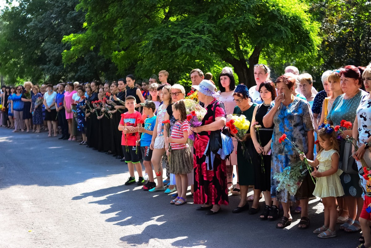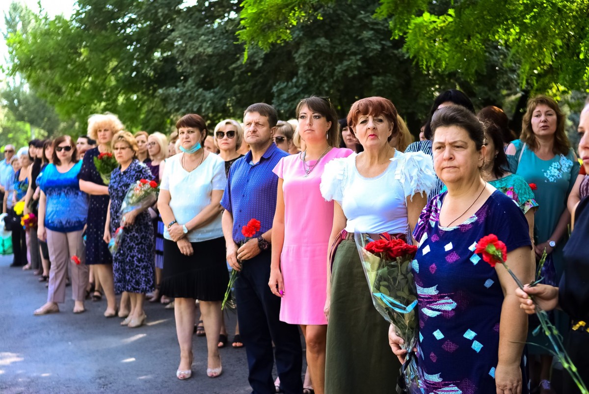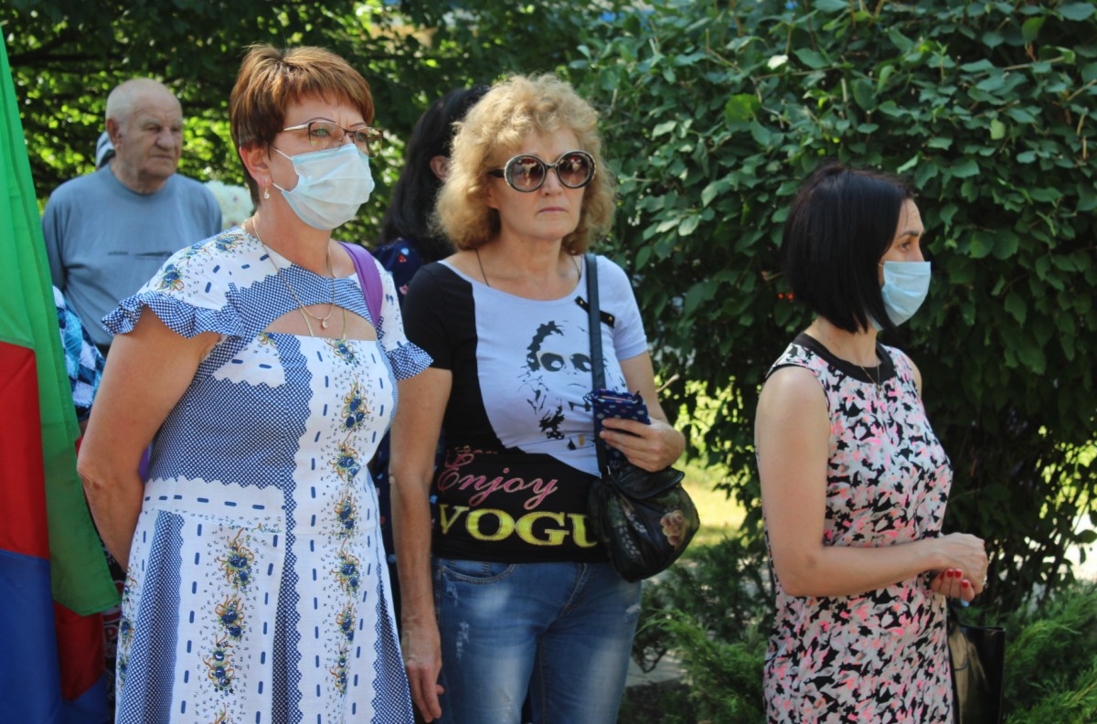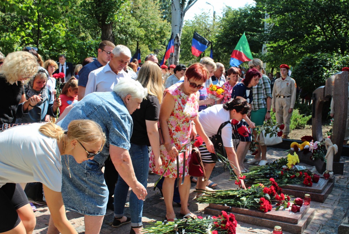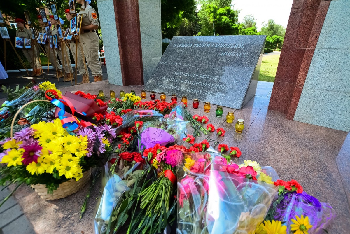 У памятного знака «Защитникам и жителям города Шахтерска и Шахтерского района, погибшим в ходе боевых действий в июле-августе 2014 года» собрались около 200 человек, чтобы почтить память погибших в результате вражеской атаки на город.