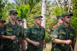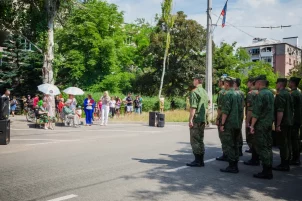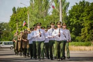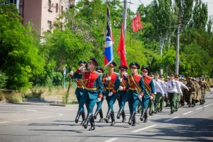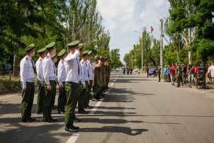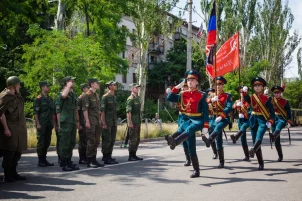 Курсанты Донецкого высшего общевойскового командного училища, держа в руках Знамя Победы и флаг Донецкой Народной Республики, парадным строем прошли по проспекту Строителей. За ними под песни военных лет последовали будущие офицеры.