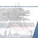 — предоставление работникам молока или спецпитания (основание: ст. 166 КЗоТ, постановление Госкомитета СССР по труду и социальным вопросам и Президиума ВЦСПС от 16.02.1987 г. года №731/П-13 «О Порядке бесплатной выдачи молока или других равноценных пищевых продуктов рабочим и служащим, занятым на работах с вредными условиями труда», на основе Перечня химических веществ, при работе с которыми в профилактических целях рекомендуется употребление молока или других равноценных пищевых продуктов (утвержденный МЗ СССР 04.11.1987 г. за №4430-87). Выдается молоко в тот день, когда работники фактически выполняют работы, связанные с производством или использованием химических веществ, предусмотренные вышеуказанным Перечнем, независимо от концентрации в воздухе рабочей зоны и продолжительности действия этих химических веществ;