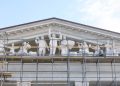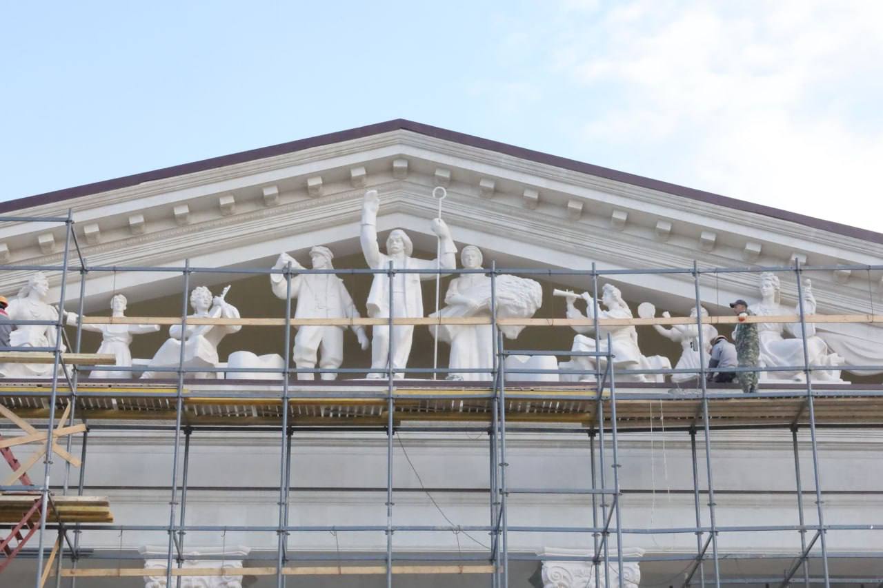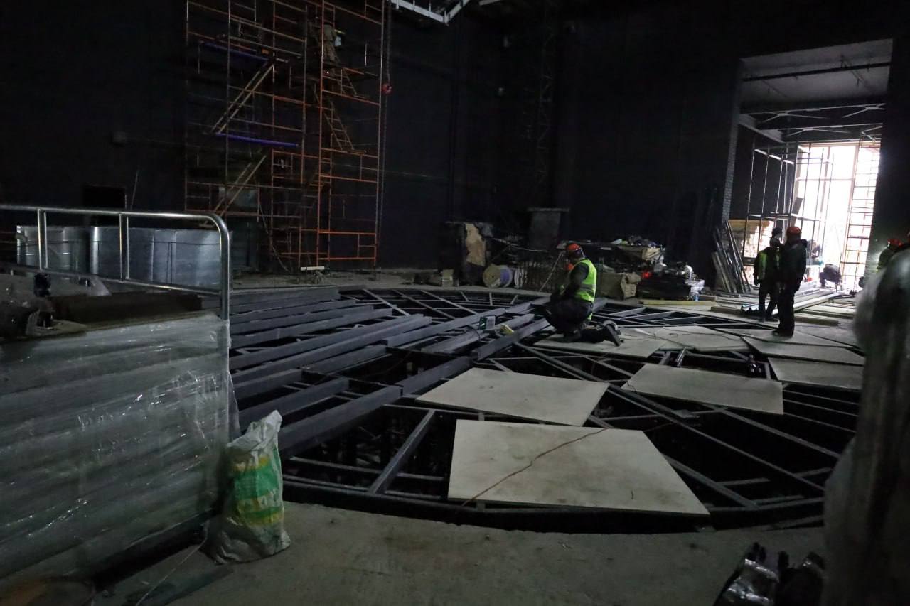 Сейчас завершаются монтаж металлоконструкций крыши и облицовка стен декоративным камнем. Установили девять скульптурных фигур на фронтоне здания. Заканчиваем и благоустройство прилегающей территории — укладку тротуарной плитки. Активно продвигается ремонт внутренних помещений и монтаж сложных конструкций, необходимых для полноценной работы театра, в том числе поворотного круга сцены.