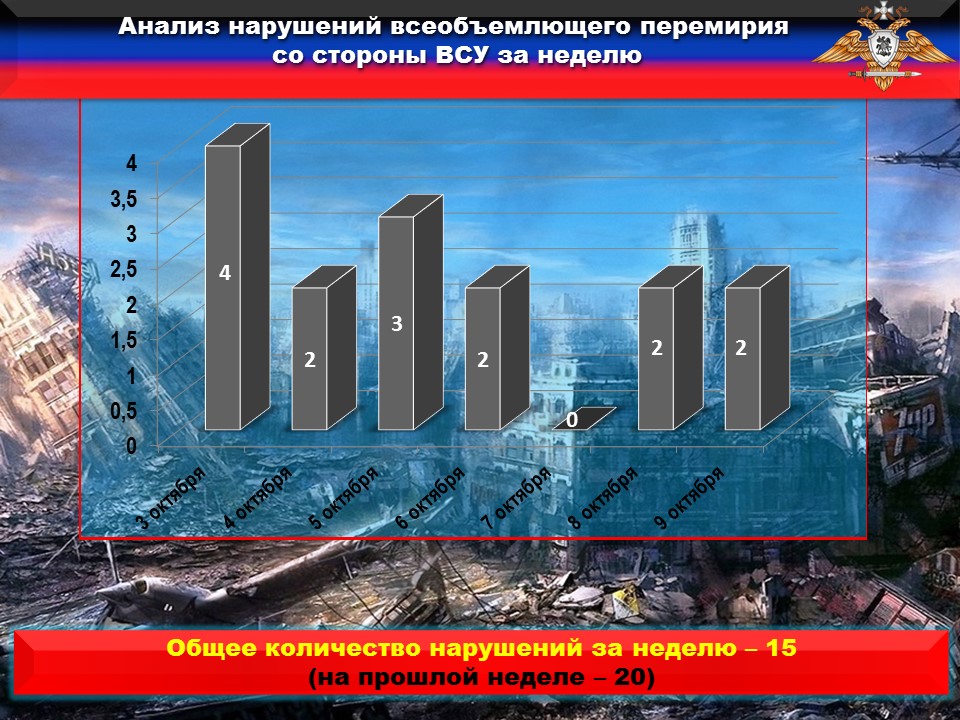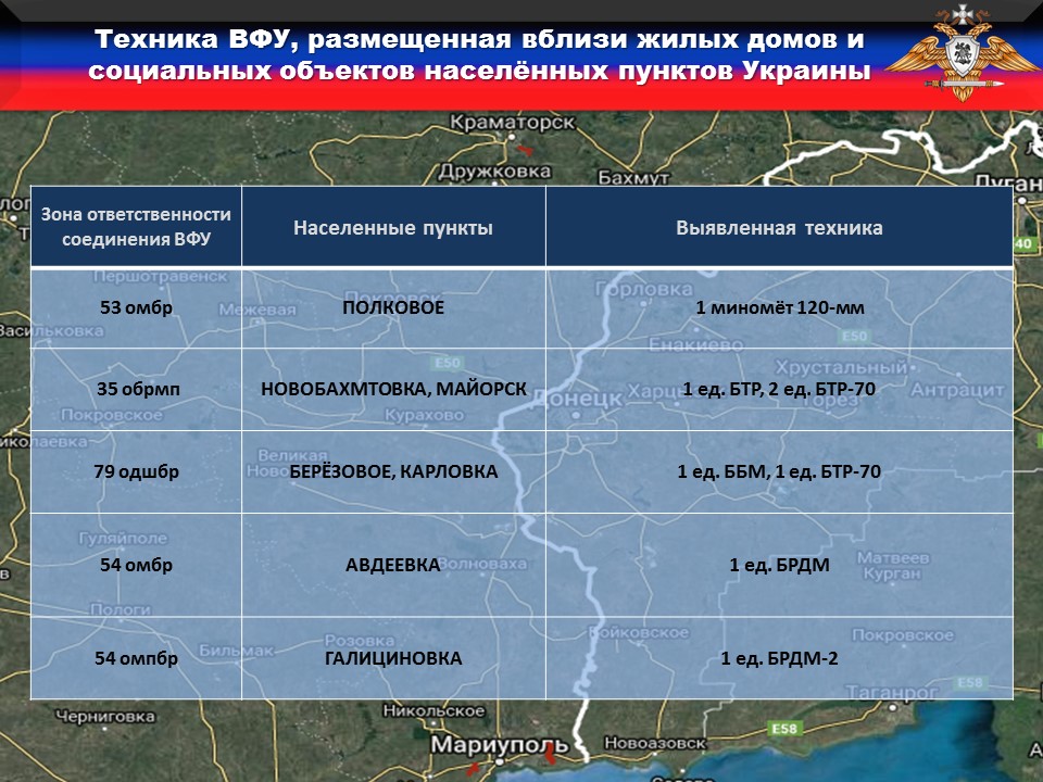 Миссией ОБСЕ подтверждены очередные факты размещения подразделениями ВФУ вооружения и военной техники вблизи жилых домов и муниципальных объектов на подконтрольной Украине территории, что является нарушением третьего пункта дополнительных мер. За истекшую неделю противник разместил восемь единиц вооружения и военной техники.